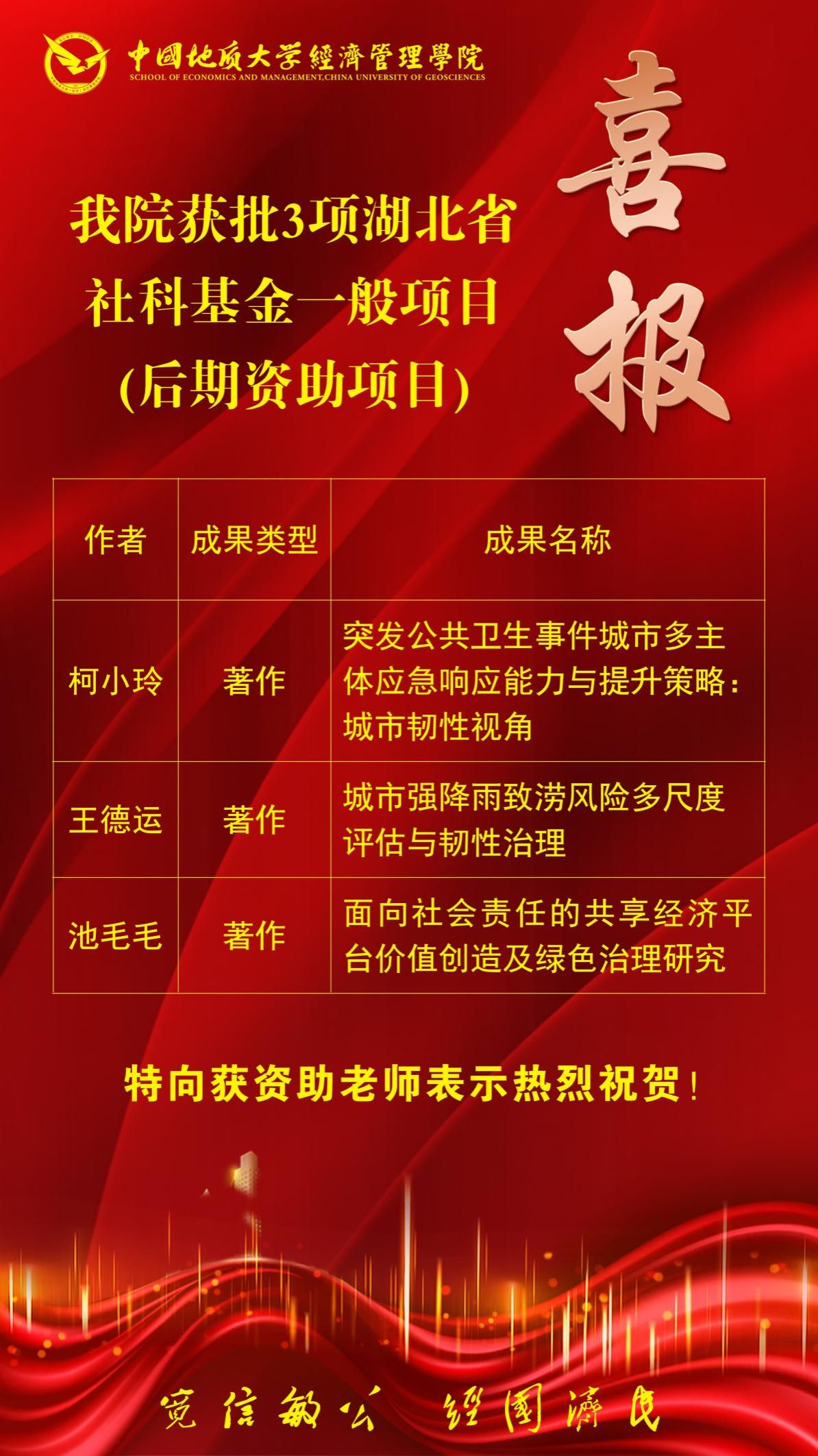 (通讯员 胡松琴)11月14日,2023年度湖北省社科基金一般项目(后期资助项目)拟立项名单公布,澳门电子pg游戏官网柯小玲、王德运、池毛毛三位老师申报的课题项目成功立项,澳门电子科研成果再次喜获丰收。