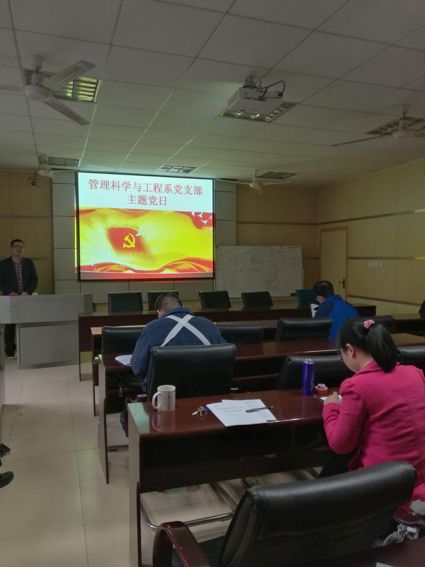 内容:全体党员齐唱国歌、重温入党誓词,集体诵读党章,组织委员报告了本月缴纳党费情况,党员交纳党费。集中学习了“两会”精神、《关于加强和改进新形势下高校思想政治工作的意见》,全体党员热烈讨论,就学习《意见》和“两会”精神谈了体会,认为在今后的教研工作中要将“两学一做”学习教育与学习贯彻讲话精神及十八届六中全会精神紧密结合起来,将“基础在学,关键在做”要求体现到实际行动中去。为了进一步加强学术交流,利用党的主题日机会,邀请湖北经济学院副院长施文副教授,针对科研经历和学术经验进行交流,分享心得,反响良好。