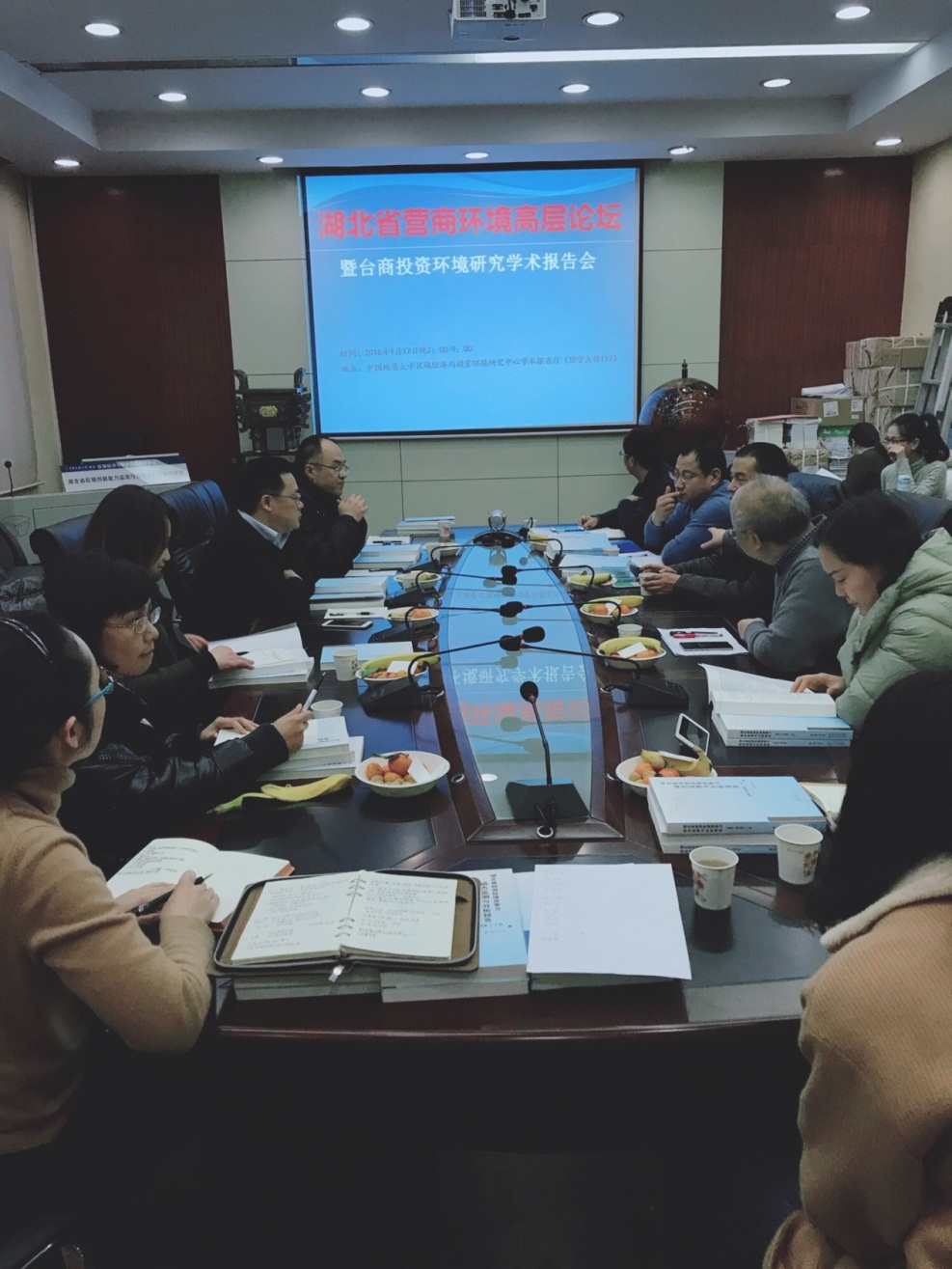 (通讯员吴磊、谢伟伟)2018年1月17日,“湖北省营商环境高层论坛暨台商投资环境研究学术报告会”在澳门电子pg游戏官网(武汉)区域经济与投资环境研究中心学术报告厅举行。湖北省台办王光斌处长、朱琨科长,经管学院杨树旺副院长、区域经济与投资环境研究中心邓宏兵教授,以及相关研究领域的专家、师生代表共计30余人参加了会议。邓宏兵教授主持了会议。
