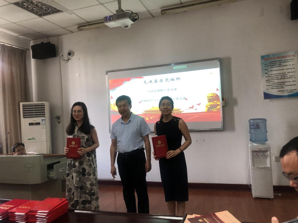 院长杨树旺宣读《中共澳门电子pg游戏官网(武汉)澳门电子pg游戏官网委员会关于表彰2018-2019年度学院先进基层党组织、优秀共产党员、优秀党务工作者和师德师风道德模范的决定》。经济系教职工党支部、管理科学与工程系教职工党支部获评学院先进基层党组织;肖建忠、王广民、 李江敏、王然、龚承柱、田昆同志获评学院优秀共产党员;齐睿、孙涵、梁玥琳获评学院优秀党务工作者;朱冬元、 江毅、吴磊、余敬、屈文彬、徐德义、梁玥琳、隆雁翔同志获评学院师德师风道德模范。院党委书记杨昌锐为获得学院奖励的集体和个人颁奖。