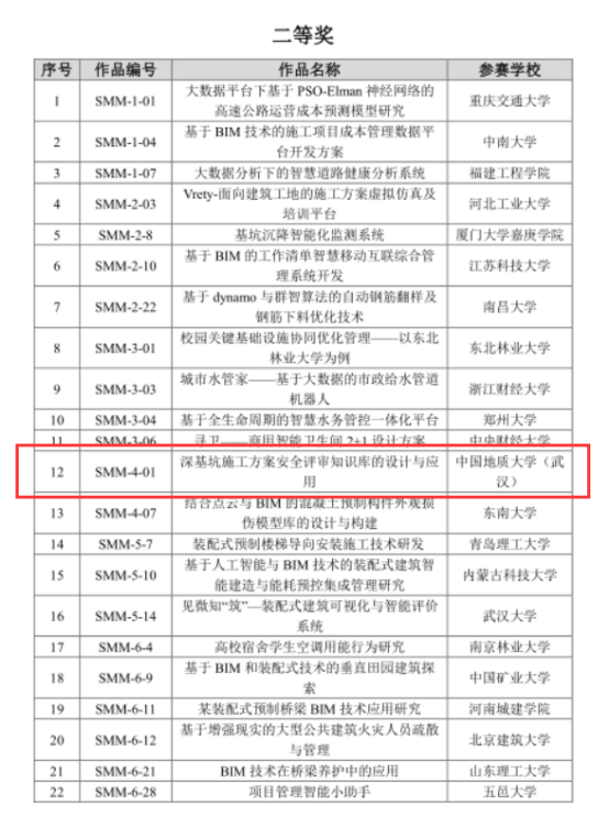 澳门电子pg游戏官网(武汉)澳门电子pg游戏官网工程管理专业与计算机学院师生联合组队参加了首届大赛。团队全体成员以智慧建造为主题,经过四个多月的努力研究与开发,完成了“深基坑施工方案安全评审知识库的设计与应用”作品,在最终的决赛中取得二等奖的好成绩(一等奖10支代表队、二等奖22支代表队)!