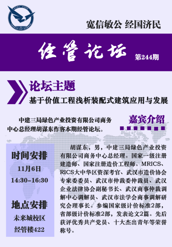 2020年11月6日下午,中建三局绿色产业投资有限公司商务中心胡谋东总经理做客经管论坛,在未来城校区澳门电子pg游戏官网422作了《基于价值工程浅析装配式建筑应用与发展》的报告。王广民、孙涵、翁克瑞、柯小玲、何晨琛、卢辉、彭亚婷等老师及多位博、硕士研究生到场聆听胡谋东总经理的精彩报告。