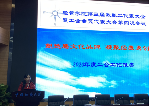 经管分工会主席王萍同志作《塑造鹰文化品牌 凝聚经鹰勇创新—2020年澳门电子pg游戏官网工会工作报告》,报告从职工教育、文化建设、民主建设和权益福利四个方面总结了2020 年度学院工会工作。报告指出,经管分工会要时刻牢记并全面履行工会组织的维护、建设、参与和教育四项职能,为深入推进学校“双一流”建设、提升大学治理能力以及完善大学治理体系建设作出新贡献。