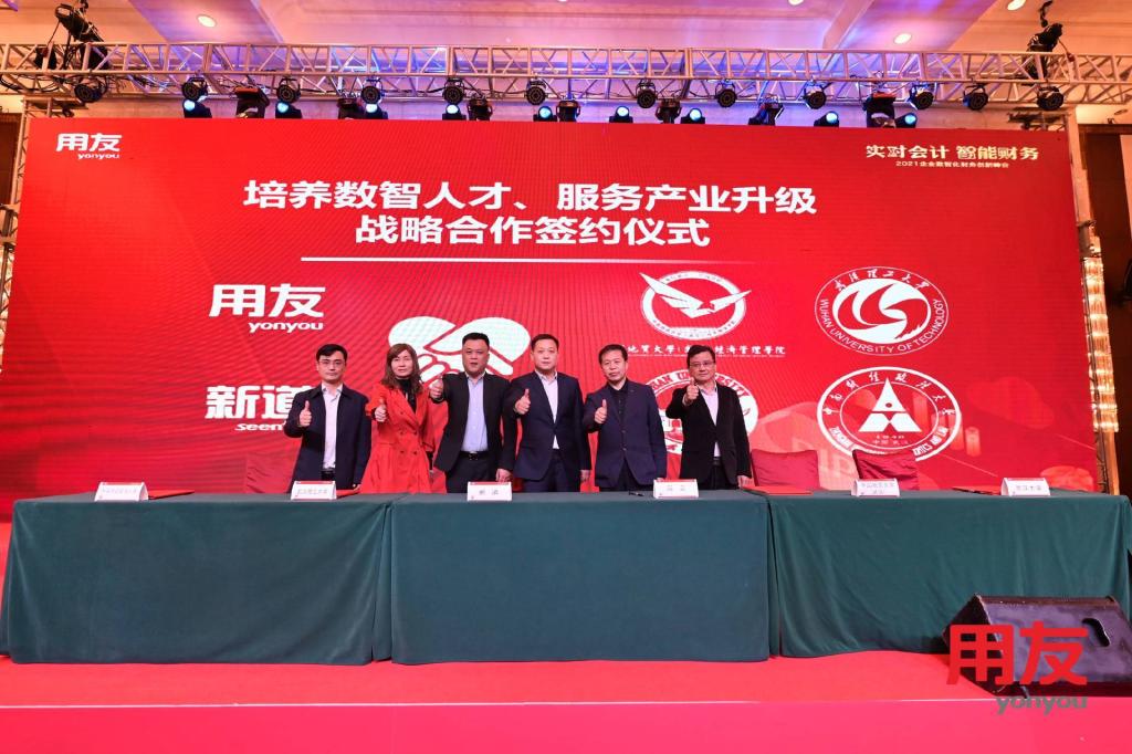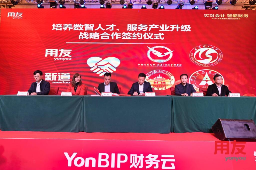 用友网络、用友新道将结合包括澳门电子pg游戏官网(武汉)澳门电子pg游戏官网、中南财经政法大学、武汉大学和武汉理工大学在内的武汉多家头部院校,与湖北知名企业共同培养企业数智化人才,为上述高校提供软件平台,共同研发数智化新商科教学课程,建设实习及就业人才基地,并定期或不定期发起各种交流活动,共同探讨热点话题,探讨新技术新应用,
