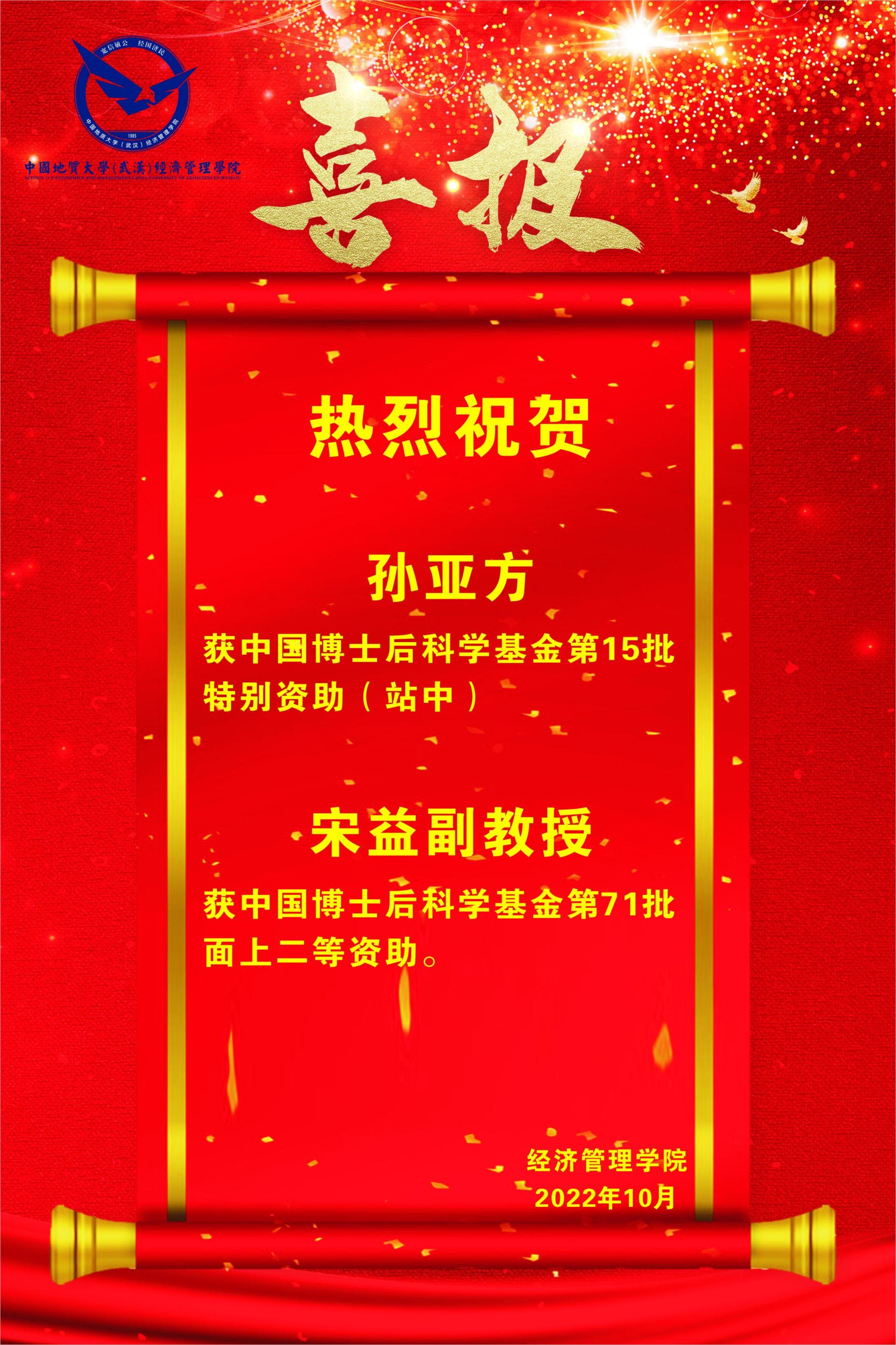 近日,中国博士后科学基金会公示了2022年度中国博士后科学基金特别资助名单和中国博士后科学基金第71批面上项目资助名单。澳门电子获批2项资助,其中孙亚方获得第15批中国博士后科学基金特别资助(站中),宋益副教授获得中国博士后科学基金第71批面上二等资助。