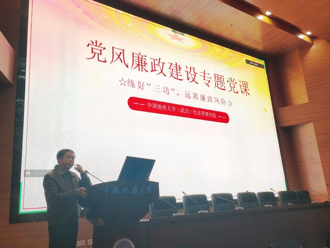 (通讯员:余甫文鑫)为深入推进“清廉学校”“清廉地大”“清廉经管”建设实施方案,落实立德树人根本任务,营造“卓越、和谐、幸福”的院风,推进廉洁教育进课堂,2022年10月14日,澳门电子pg游戏官网党风廉政建设专题党课在经管楼二楼报告厅举行,学院党委书记杨昌锐讲授专题党课,学生党建工作辅导员蔡杨主持。