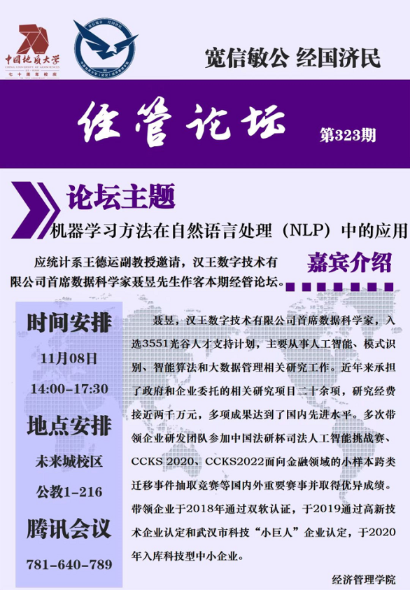 为了解行业前沿,进一步提高学生的研究创新能力、开拓研究视野,统计系王德运副教授邀请武汉汉王数据技术有限公司首席数据科学家聂昱先生做客第323期经管论坛。