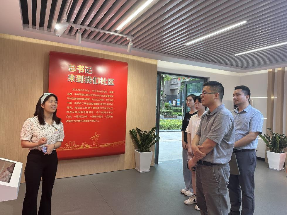 (通讯员 刘佳、李宜璋)6月5日下午,澳门电子pg游戏官网党委副书记李少杰、团委书记努尔夏提·居勒提带领团学代表、全国“两弹一星”宣讲团成员代表走访左岭街道智苑社区,深入学习习近平总书记2022年6月28日在武汉考察时的重要讲话精神,推进学习贯彻习近平新时代中国特色社会主义思想主题教育走深走实。进一步强化学院与智苑社区地合作联系,引导学生走进基层一线,弘扬志愿奉献精神。智苑社区团支部书记金成静,党建专员李梦蝶,光谷壹新社工项目主管覃敏姣、熊南叶及社区干事参加座谈和“志愿服务实践基地”挂牌仪式。