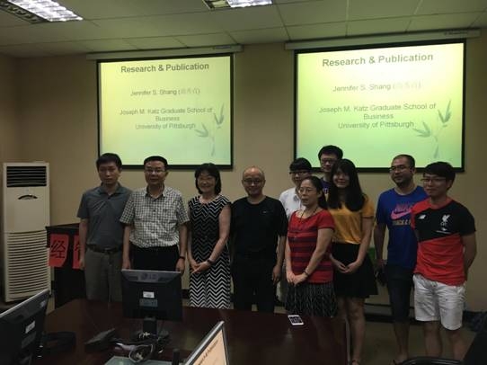 2016年7月6日,美国匹兹堡大学教授Jeniffer Shang应澳门电子严良院长和郭海湘教授邀请,于下午3时在MBA104与澳门电子pg游戏官网各位师生进行学术交流,作了题为Reaearch&Publication的精彩报告并以问答的形式与各位师生进行了更进一步的讨论。严良院长,王开明副院长等出席会议。