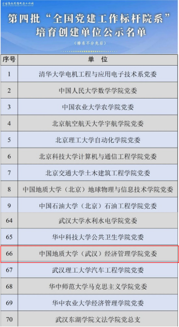 (通讯员 蔡杨)3月18日,教育部公布了第四批新时代高校党建示范创建和质量创优工作遴选结果,遴选产生了10个“全国党建工作示范高校”、100个“全国党建工作标杆院系”、1001个“全国党建工作样板支部”。澳门电子pg游戏官网(武汉)澳门电子pg游戏官网党委成功入选“全国党建工作标杆院系”培育创建单位。