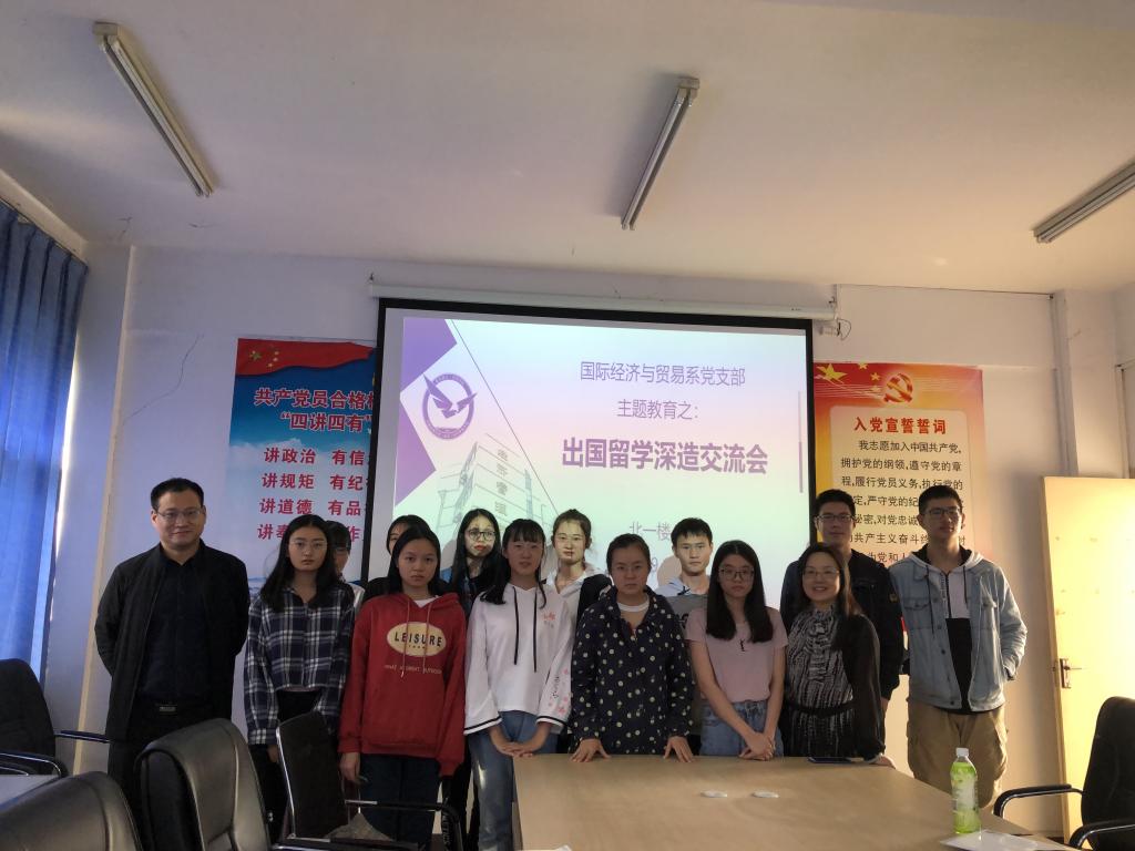 (通讯员:易杏花 苗瑞瑞)2019年10月24日14:00—16:30,澳门电子pg游戏官网国际经济与贸易系党支部在北一楼421室召开了出国留学深造交流会,这既是党支部“结对领航”的一项重要工作内容,也是“不忘初心 牢记使命”主题教育的一个重要环节。活动由国际经济与贸易系党支部书记易杏花主持,系主任白永亮、系副主任洪水峰,国贸系2016级本科生田翔、安浩楠、邓学霖,以及17级——19级有志于出国留学深造的学生参加了本次活动。