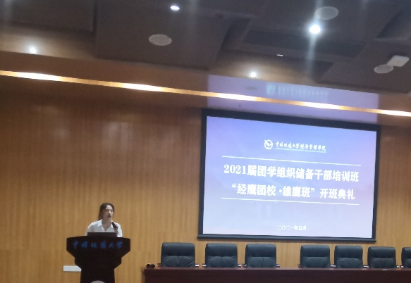 2021年5月22日下午14:00,澳门电子pg游戏官网2021届团学组织储备干部培训班——“经鹰团校·雄鹰班”开班仪式暨团学组织党史学习教育活动在经管楼一楼报告厅召开。出席本次会议的有:澳门电子pg游戏官网党委副书记李少杰老师,院团委书记田昆老师,学工组张弛老师、徐媛老师和徐天宜老师,学生会主席团成员及2021届储干班全体成员。