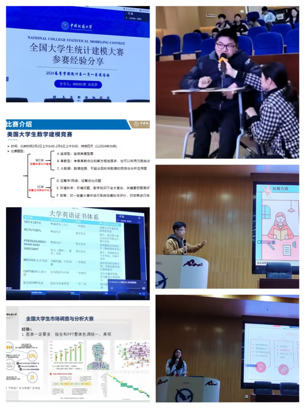 活动共分为三个部分:第一部分是邀请七位统计学专业同学分享学科竞赛和创新创业项目申报经验;第二部分是张弛老师介绍学院奖励办法并鼓励大家积极参加比赛;第三部分是师生交流。