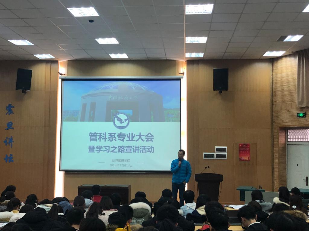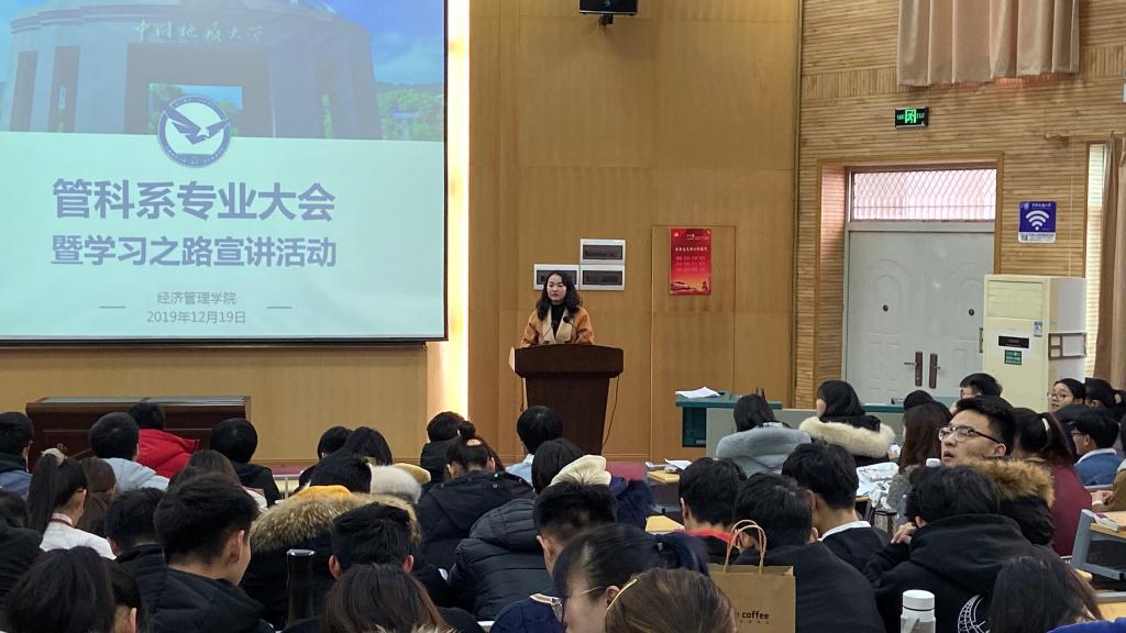 2019年12月19日,澳门电子pg游戏官网管理科学与工程系本科生专业大会暨学习之路宣讲活动在教三楼109召开,管科系副主任翁克瑞老师、管科系辅导员徐媛老师出席大会,17-19级管科系全体学生参会,会议由徐老师主持。