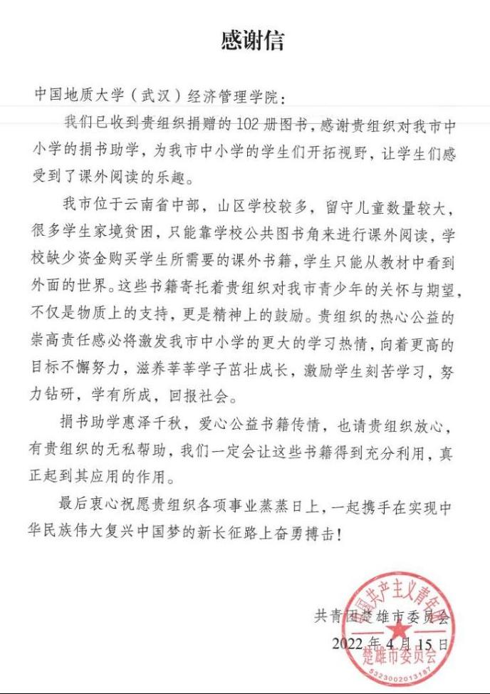 在一年的支教生活中,张康同学始终不忘自己是一名地大经管人,生活中发扬“艰苦朴素,求真务实”的校训精神,牢记“宽信敏公,经国济民”的院训精神,做到把地大精神带到服务地,讲好地大故事。积极配合研支团完成把地大特色活动开展到龙江的任务;利用班会时间给学生们播放地大相关宣传视频,讲述个人求学的故事,播撒希望种子。在五四青年节前夕,他带着支教团同学联系母校,发起向云南省楚雄市山村中小学校捐赠书籍的公益活动。本次捐赠活动得到了母校多个学院的大力支持,共筹集到书籍600余册,其中澳门电子pg游戏官网捐赠图书102册,涵盖文学、科普、经济、教育等多个领域。共青团楚雄市委员会对支教团及地大学生捐赠之举表示衷心的感谢,并向澳门电子发来感谢信。