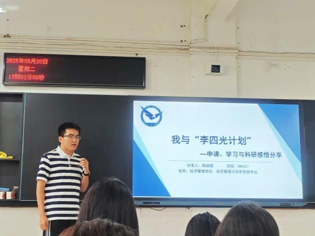 为帮助大一学生深入了解“李四光计划”选拔与培养机制,向优秀学子看齐,5月20日下午,澳门电子pg游戏官网于南望山校区北综楼111举办了“李四光计划”解读暨保研经验分享会。本次分享会邀请了澳门电子2021级吕昕桦、2022级薛政煜、2023级刘尔东三位入选“李四光计划”的同学作为嘉宾,为大一学生分享“李四光计划”准备过程和学习成长的经验心得。2024级辅导员张弛与部分2024级学生参加活动。
