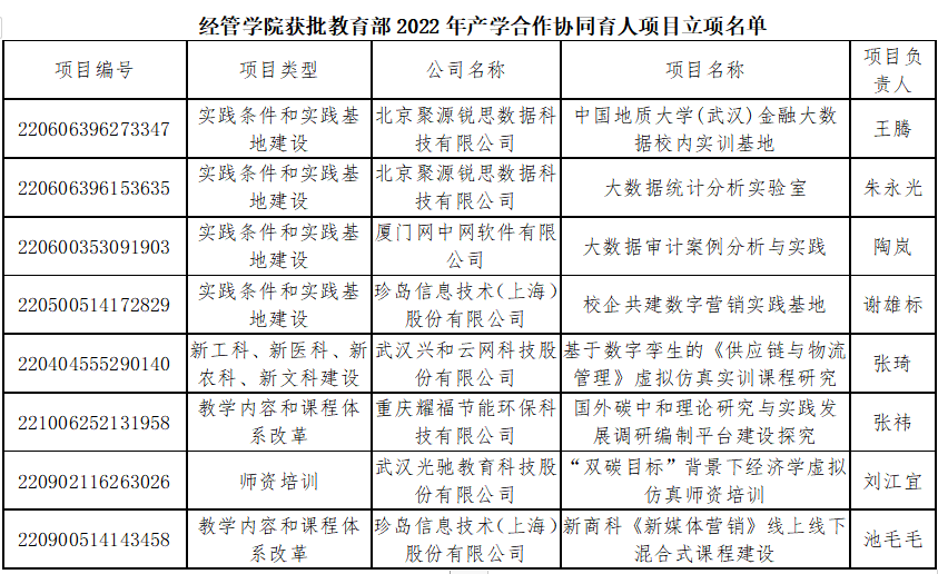 近日,教育部高教司印发了《教育部高等教育司关于公布2022年产学合作协同育人项目立项名单的通知》,我校46个项目获批立项,其中经管学院获批8项。